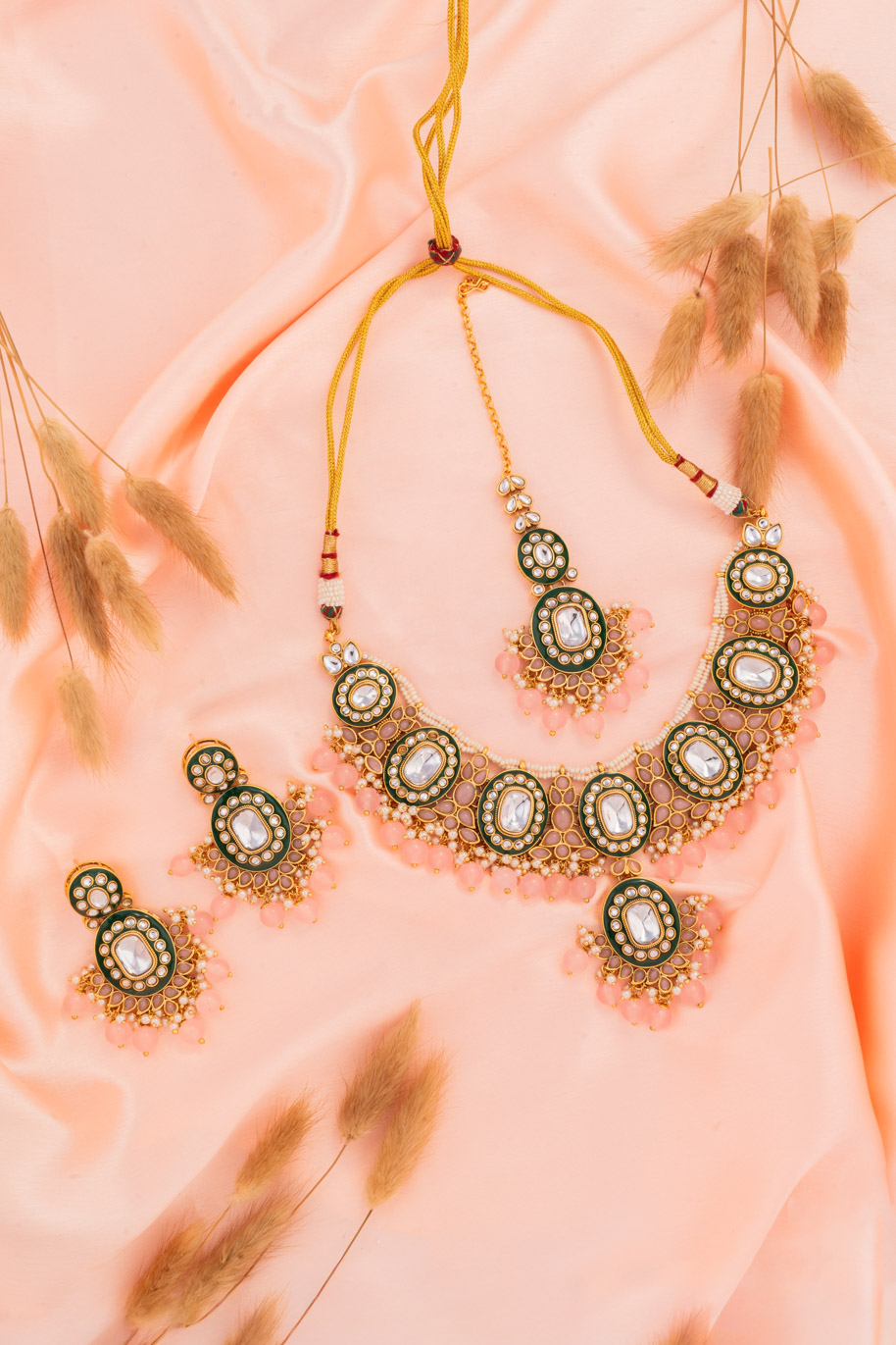 Kundan Engraved Elephant Carved Green Pearls Earrings Set