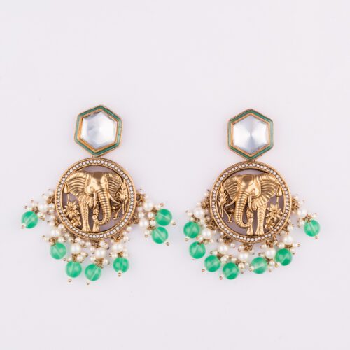 Kundan Engraved Elephant Carved Green Pearls Earrings Set