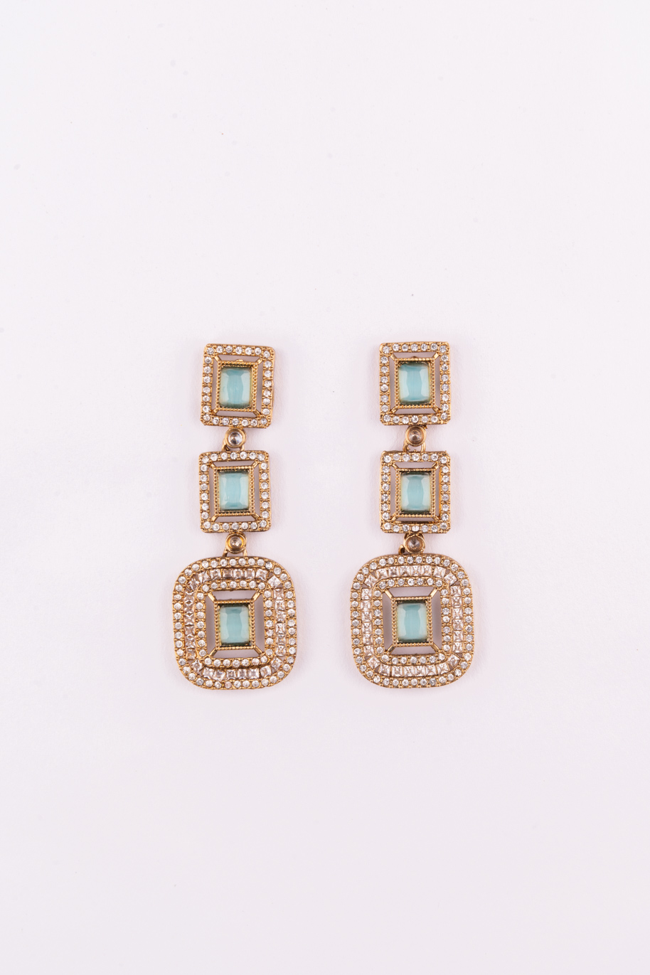 Aqua Crystals with AD and Square Gold Base Earrings Set