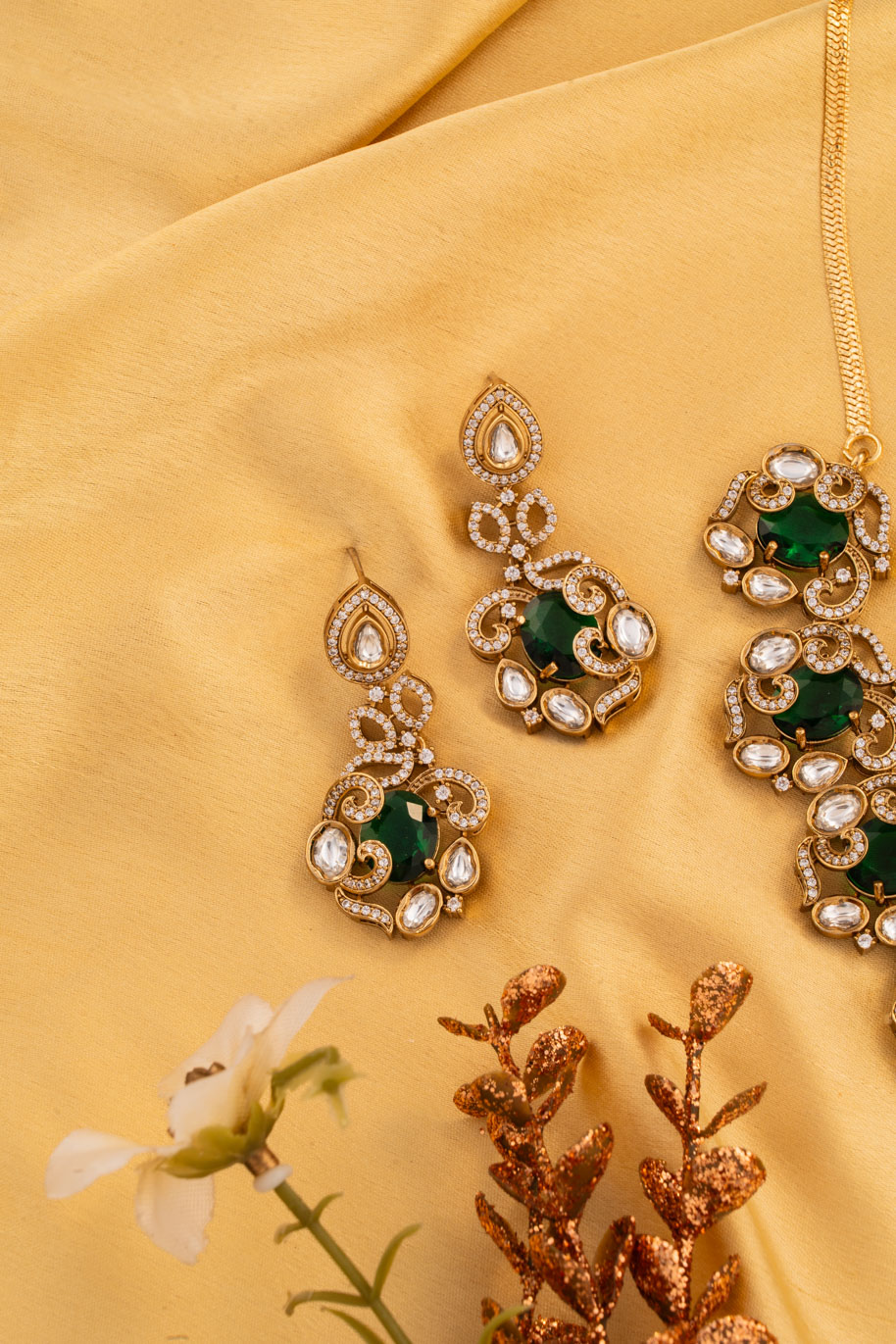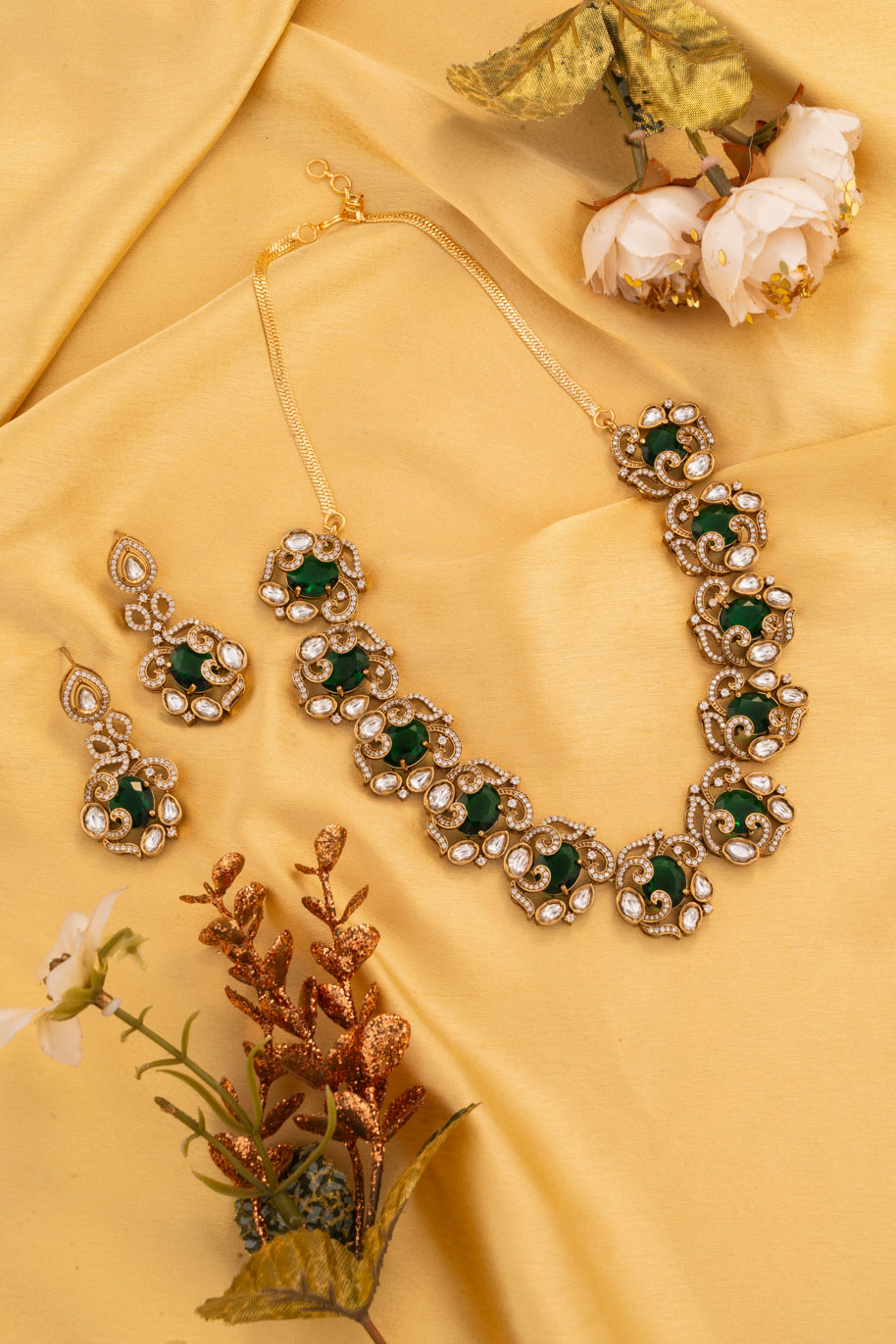 Green Square Crystal with AD on Square shaped Gold Necklace set