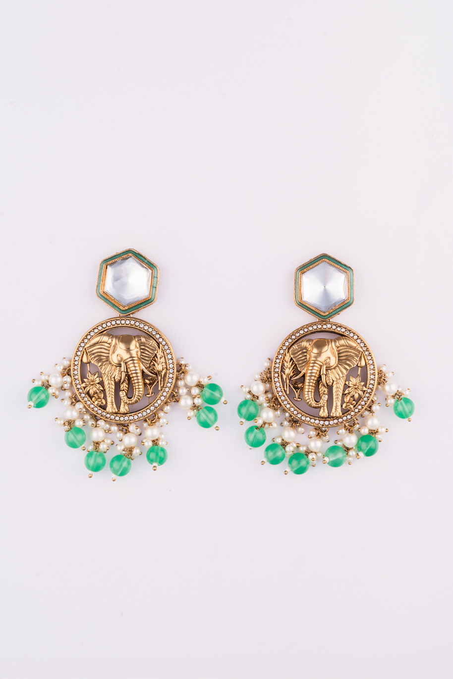 Kundan Engraved Elephant Carved Green Pearls Earrings Set