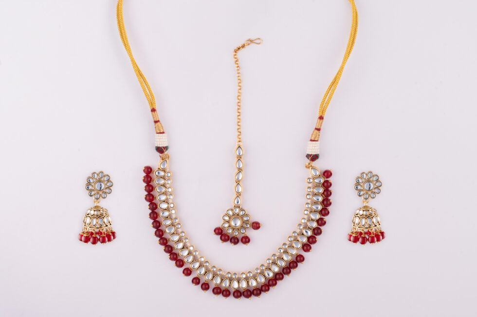 Be the first to review “Maroon Kundan and Beads with Gold polish necklace set with Tikka” Cancel reply