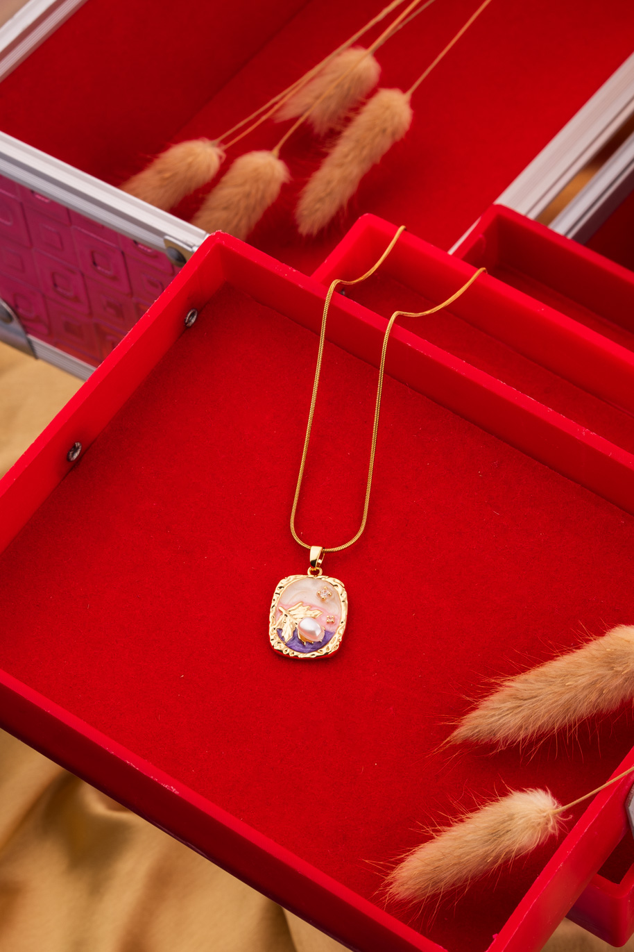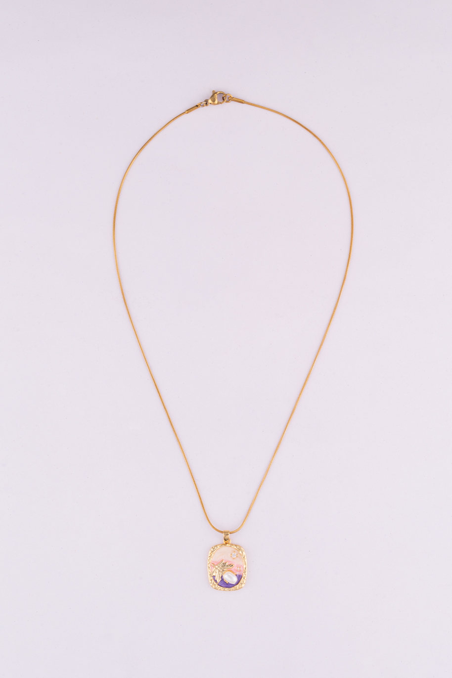 Sleek gold chain adorned with a delicate lavender pink pearl pendant