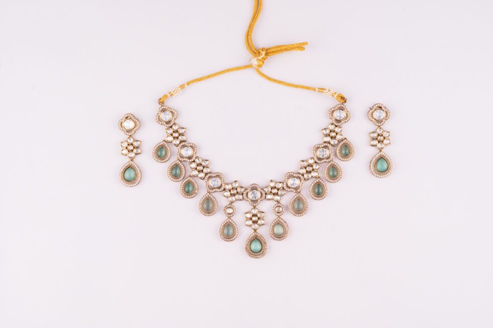 Be the first to review “Mint Green Moisannite on Kundan with AD embellished on Gold Base” Cancel reply