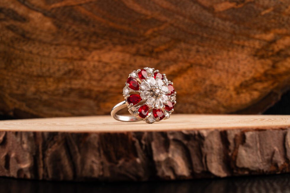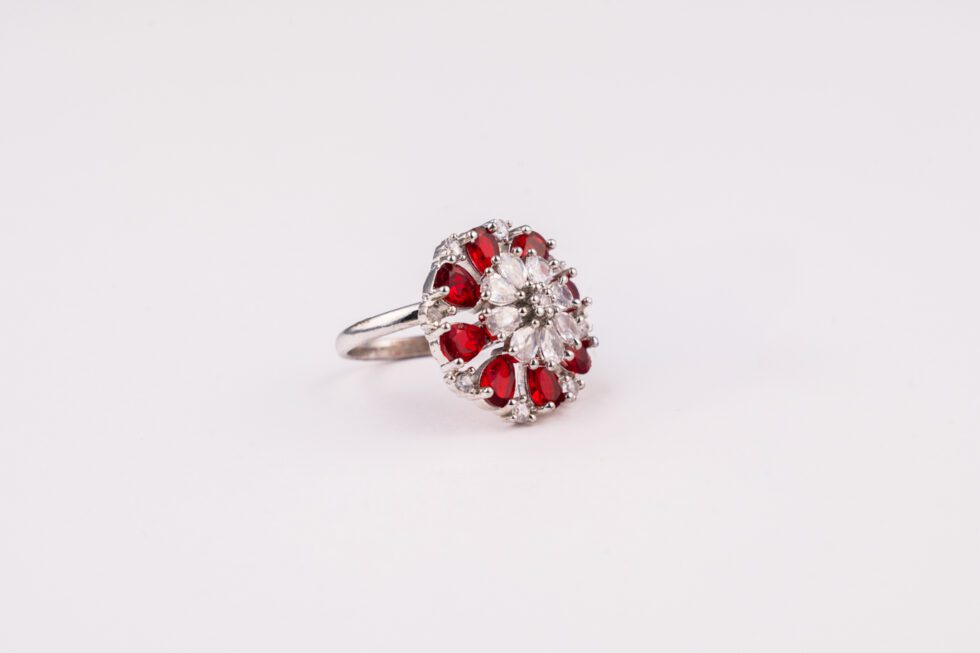 White gold adjustable ring featuring a circular red AD stone design