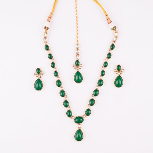 Green Square Crystal with AD on Square shaped Gold Necklace set