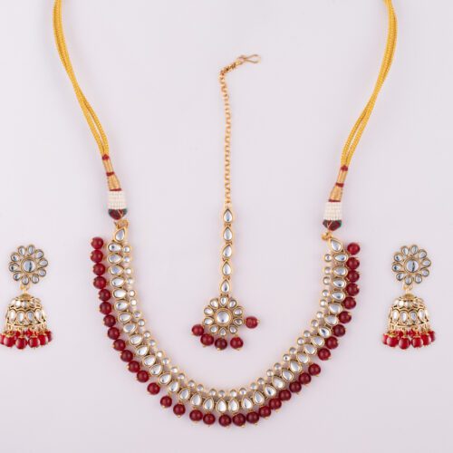 Maroon Kundan and Beads with Gold polish necklace set with Tikka