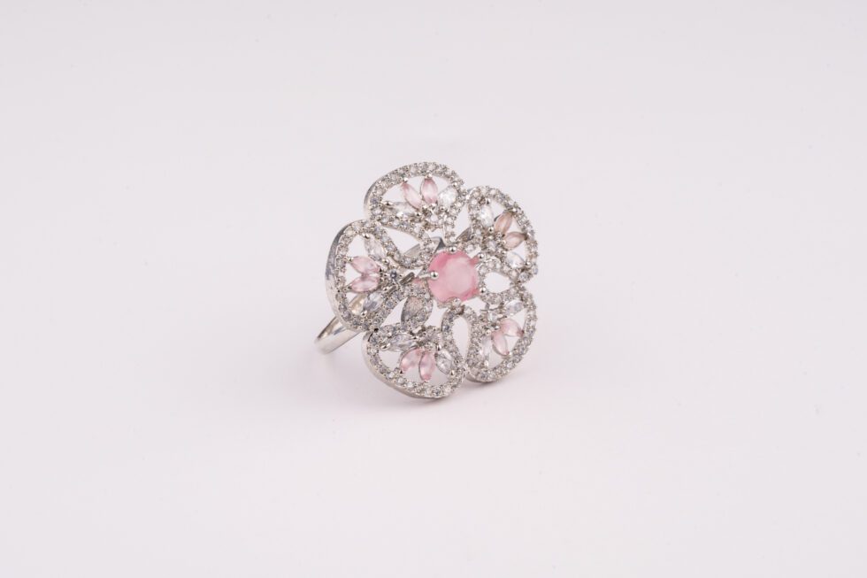 Sparkling AD Ring Flower Design with Baby Pink Stone