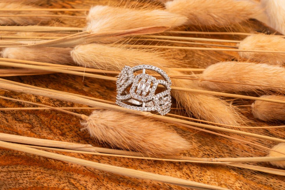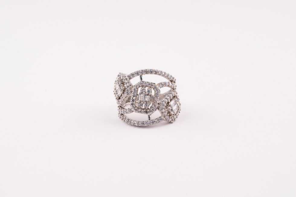White gold ring featuring a unique tri-face AD stone design